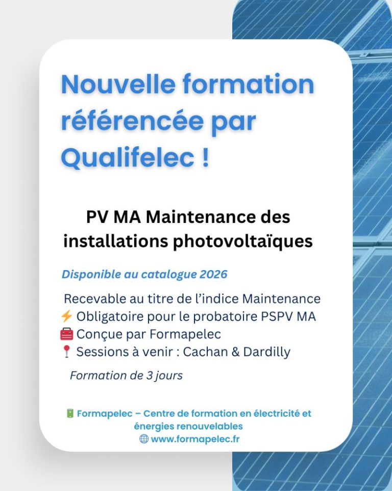 FORMAPELEC a le plaisir d’annoncer le référencement officiel par QUALIFELEC de la nouvelle formation PV MA – Maintenance des installations photovoltaïques - Qualification SPV MA